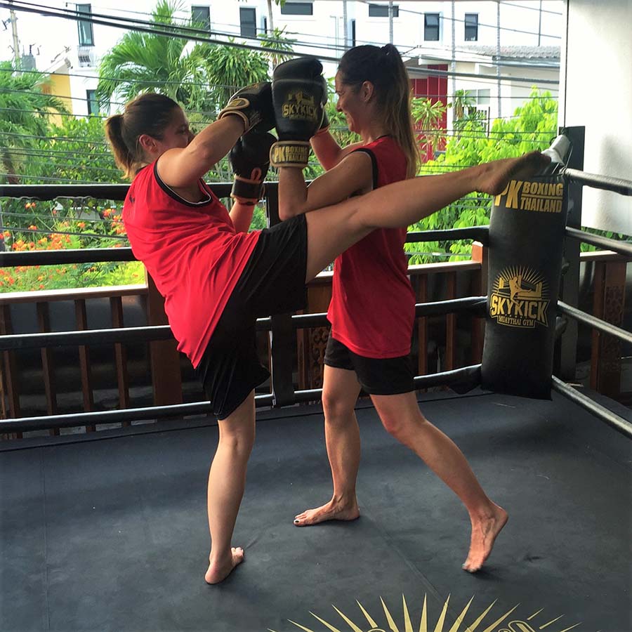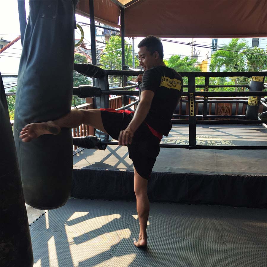 Lors de mon premier voyage en Thaïlande, je n’avais pas eu l’occasion de prendre un cours de boxe thaï – shame on me. Cette fois, il était hors de question que je passe à côté de cette expérience. Nous avons pris un cours de 1h30 au Skykick Muaythai Gym, une salle située au-dessus d’un café. Nous avons été accueillis par Elbow, Ton et Tan -sans rire.