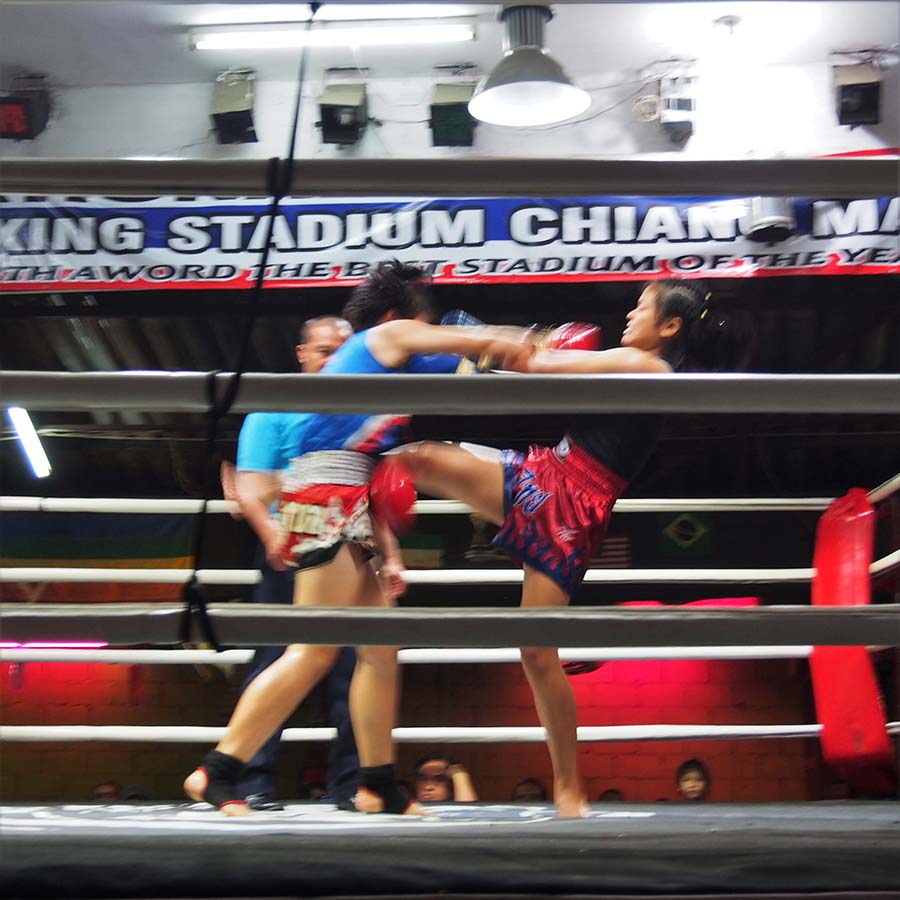 Lors de mon séjour en Thaïlande, et plus spécifiquement lors de mon passage à Chiang Maï, je me suis intéressée de près au muay-thaï – boxe thaïlandaise – pour deux raisons. Tout d’abord parce qu’il me semblait important de découvrir cette discipline qui occupe une place conséquente dans la culture thaïlandaise, ensuite parce qu’en tant qu’ancienne taekwondoïste j’étais curieuse de découvrir ce sport qui a la réputation d’être une pratique violente où tous les coups sont permis – ce qui est faux.